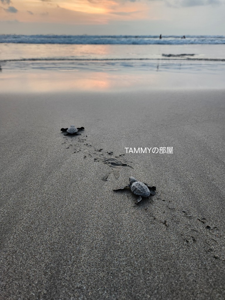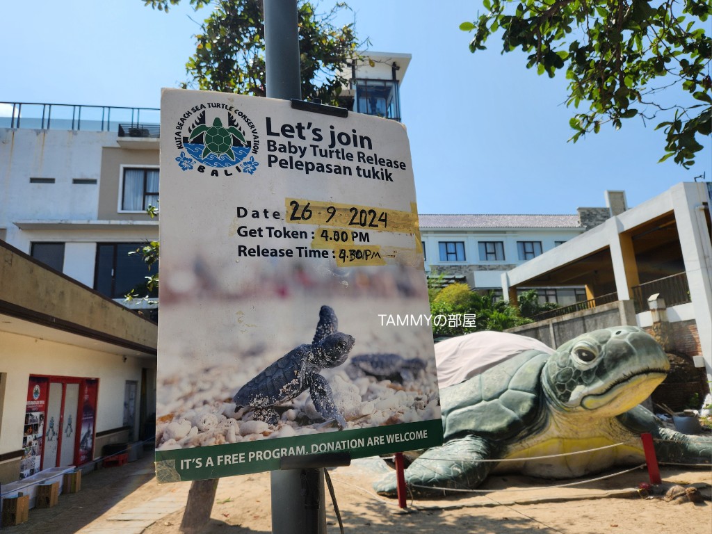 クタビーチ沿いに、ウミガメの保護団体(Bali Sea Turtle Society)のオフィスがあり、赤ちゃんウミガメの放流を行う日には、このように看板、またはSNSにてお知らせが出ます。背後の巨大ウミガメは、中が疑似砂浜になっていて、ウミガメの卵が埋まっています。ここで孵化した赤ちゃんウミガメを放流するのです。お気持ち額の寄付によって参加可能です。