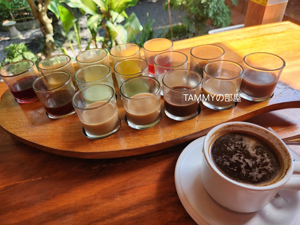 コーヒー農園ではコーヒーの実が木になっている状態からコーヒーになるまでの過程を実演してくれたり、様々なコーヒーやお茶類の飲み比べをさせてくれます。コピ・ルアクは別料金(一杯500円ぐらいだったかな?)で試飲可能です。違いのわからぬTAMMY夫婦は一杯のかけそばならぬ一杯のコピ・ルアクをシェアして楽しみました。