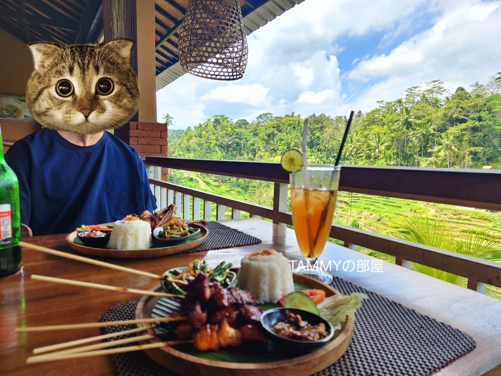 カーチャーターのガイドさんに、「ライステラスを見ながらランチができるお店」とだけオーダーして連れてきてもらった「Carik Terrace Warung(チャリックテラスワルン)」。観光客向けのカフェではありますが、雰囲気・眺望ともに抜群です。どローカルなご飯屋さんは別で体験していますので、問題なし。プレートに添えられていた生サンバルの辛みが爽やかで、とても気に入りました。
